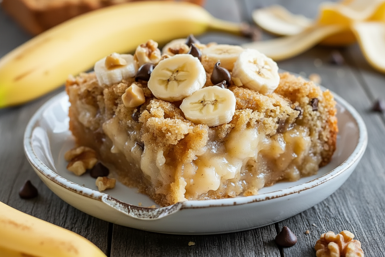 A warm, comforting dessert with a fluffy banana bread base and a sweet, buttery, cinnamon-sugar topping.