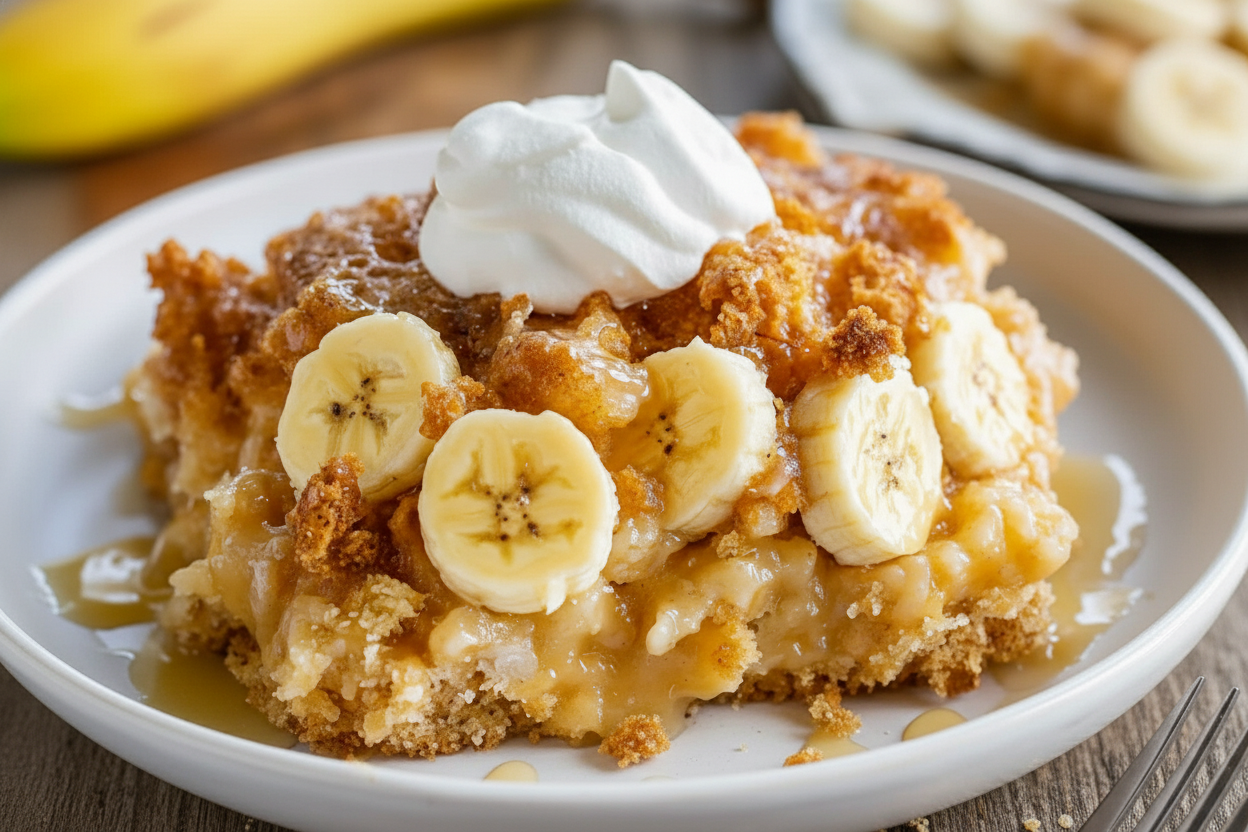 A simple, comforting dessert featuring a buttery cake base, sweet ripe bananas, and a cinnamon-brown sugar topping.