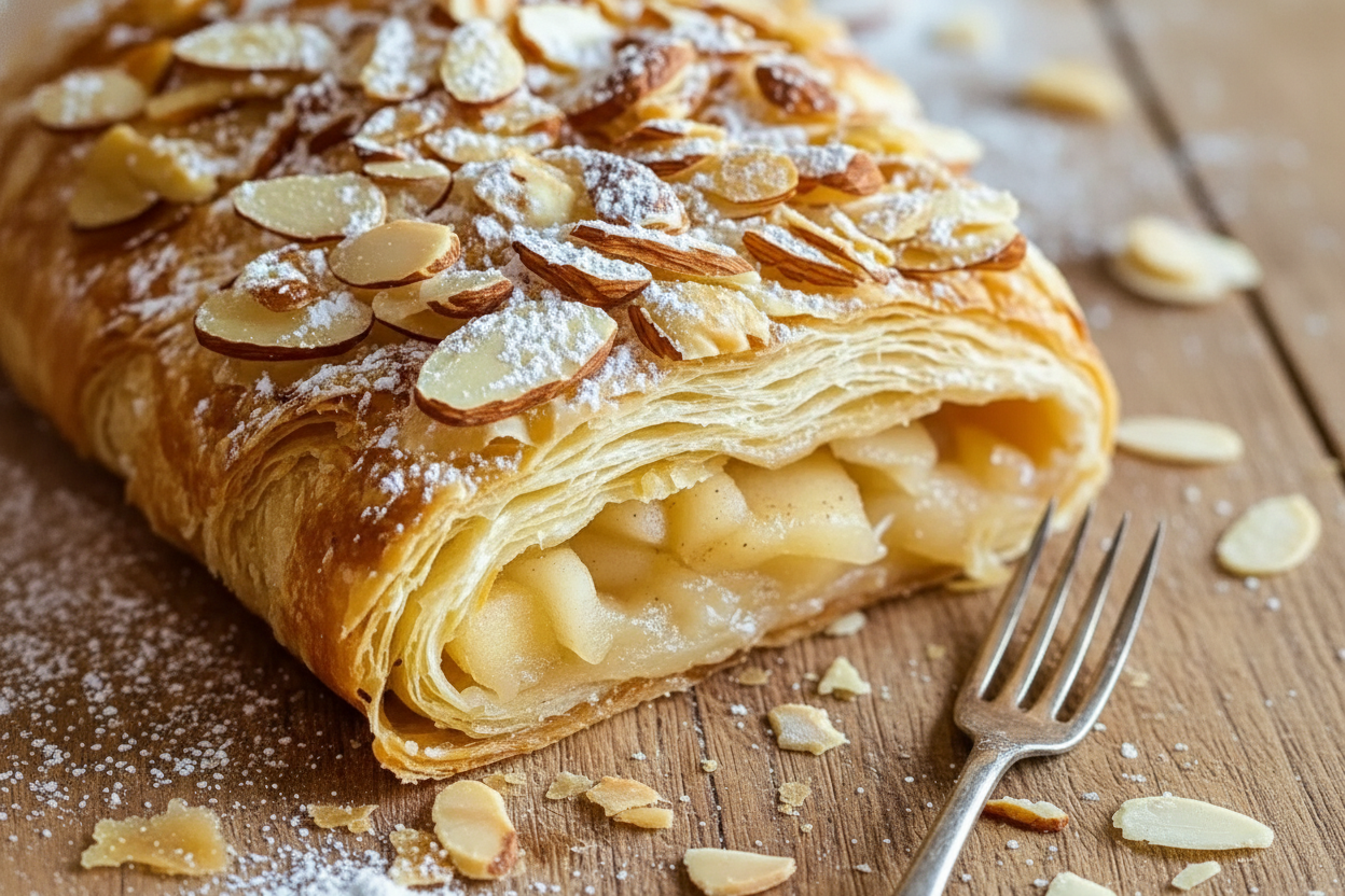 Thaw one sheet of store-bought puff pastry. Mix the almond filling. Spread it down the middle of the pastry sheet. Cut slits on both sides of the filling. Then, fold the strips over the filling in a braid. Brush with egg, add almond slices, and bake. It is much simpler than it looks. The puff pastry does all the flaky work for you.