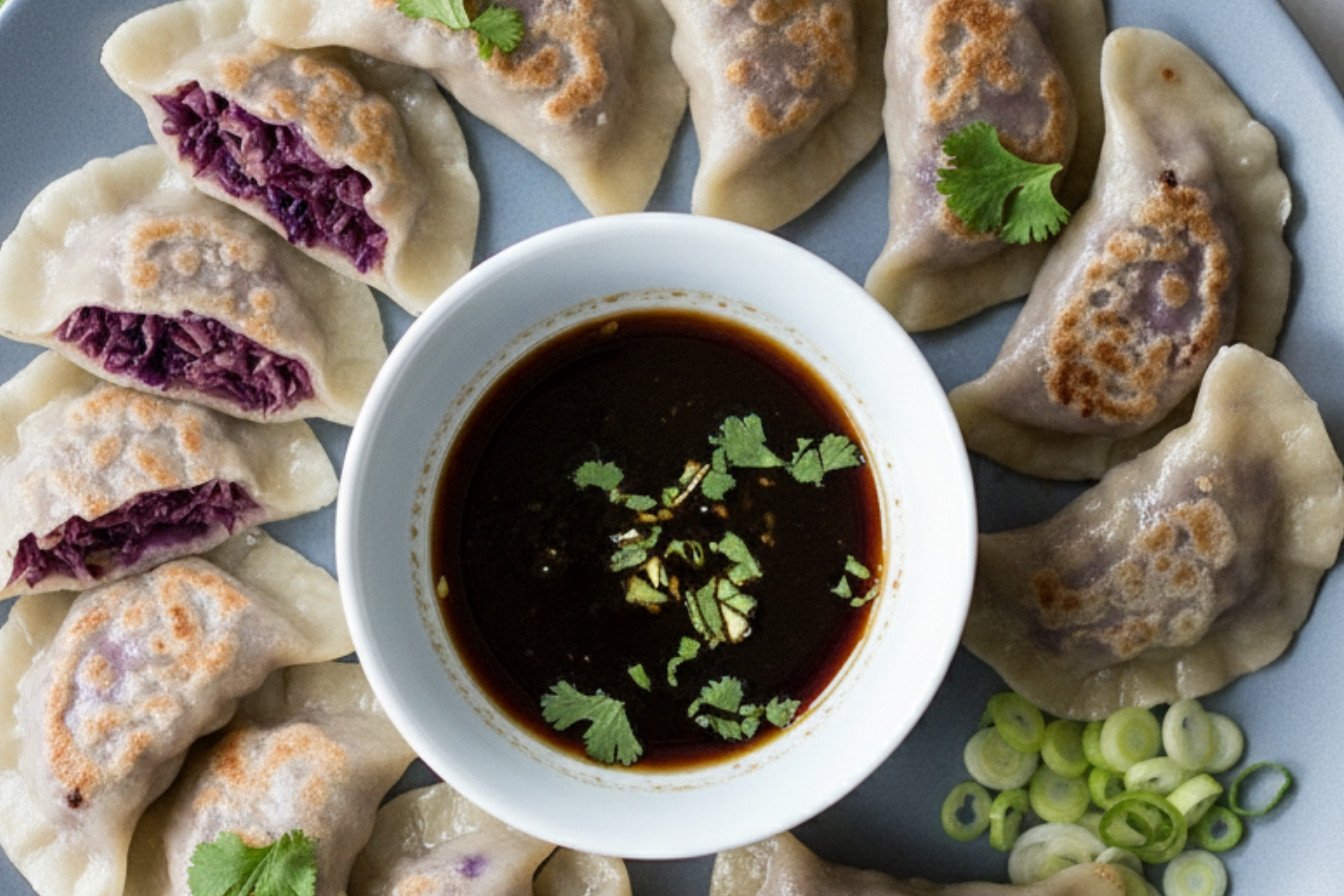 These savory steamed dumplings are filled with a flavorful mix of red cabbage, sauerkraut, and peanuts, served with a zesty garlic dipping sauce.
