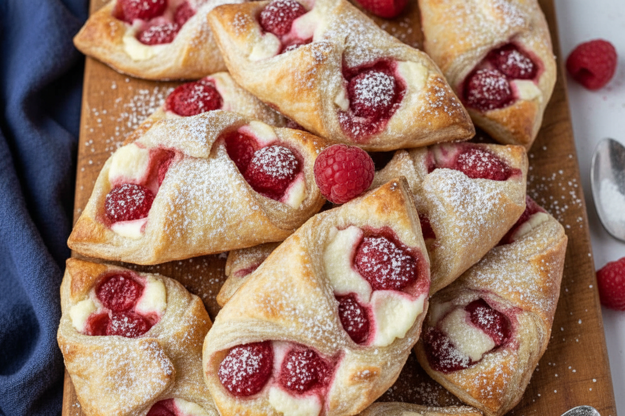 These delightful pastries combine flaky puff pastry with a sweet cream cheese filling and fresh raspberries for a perfect, easy treat.