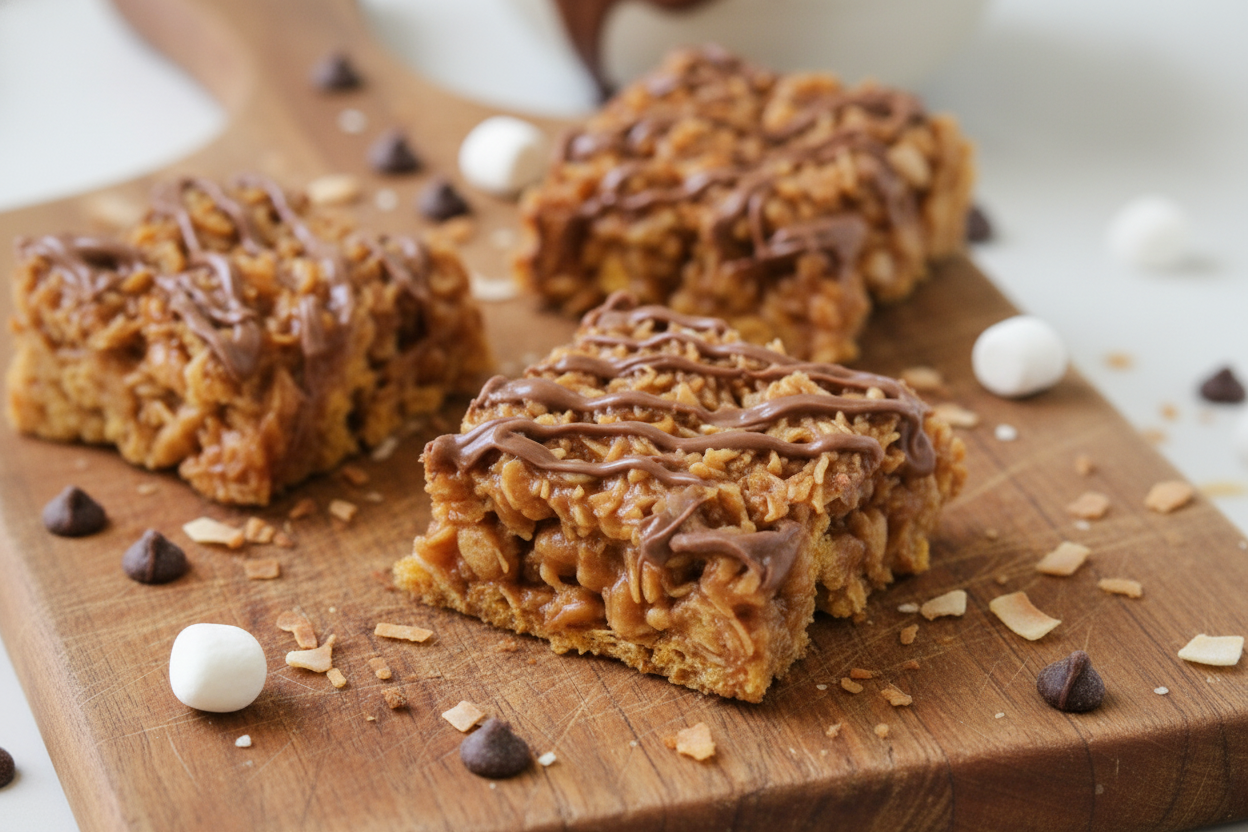 A delicious no-bake twist on the classic Girl Scout cookie, featuring a crispy cereal base, a gooey caramel-coconut layer, and a rich chocolate coating.