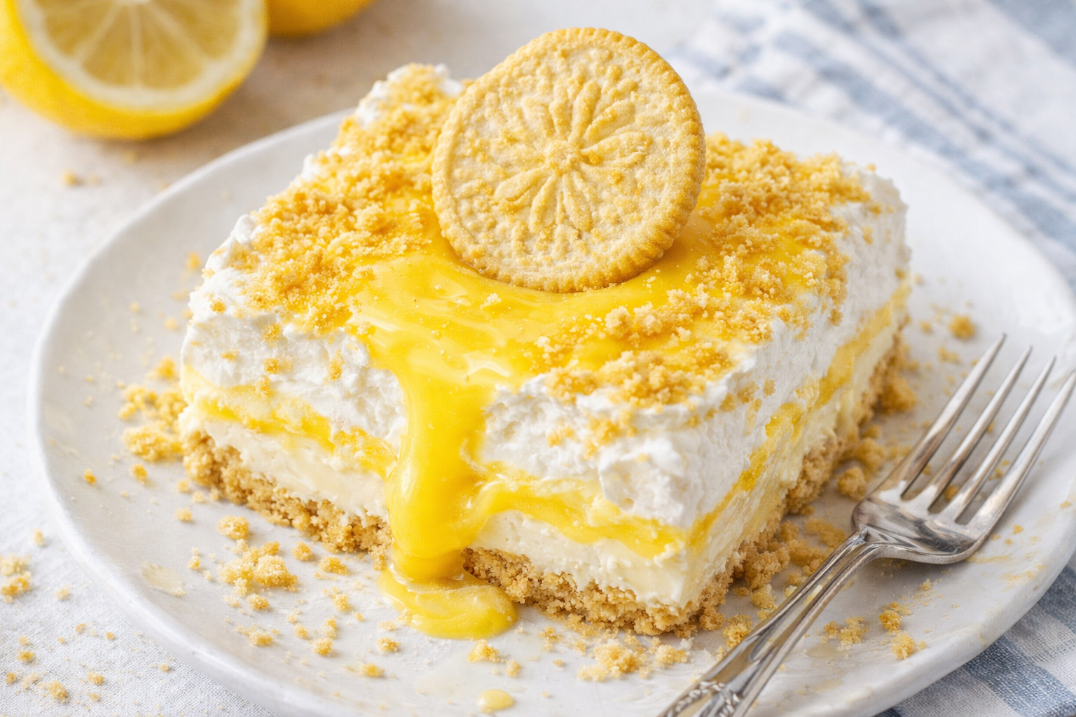 Step 1 Spray a 9×13-inch dish with nonstick spray. Crush 36 Lemon Oreos into fine crumbs. Save 3/4 cup for later. Mix the rest with melted butter. Press into the dish and freeze. Step 2 Whisk lemon pudding mix and cold milk in a bowl. Chill it in the fridge. Blend cream cheese until smooth. Add powdered sugar, lemon juice, and zest. Fold in one tub of Cool Whip. Step 3 Spread the cream cheese mix over the crust. Top with chilled pudding. Add the last tub of Cool Whip. Sprinkle saved crumbs on top. Chill for 3 hours. (Hard-learned tip: Freeze the dessert for the first hour to speed up chilling.) What’s your favorite no-bake dessert? Share below! Cook Time: None Total Time: 3 hours 22 minutes Yield: 16 servings Category: Dessert3 Fun Twists to Try