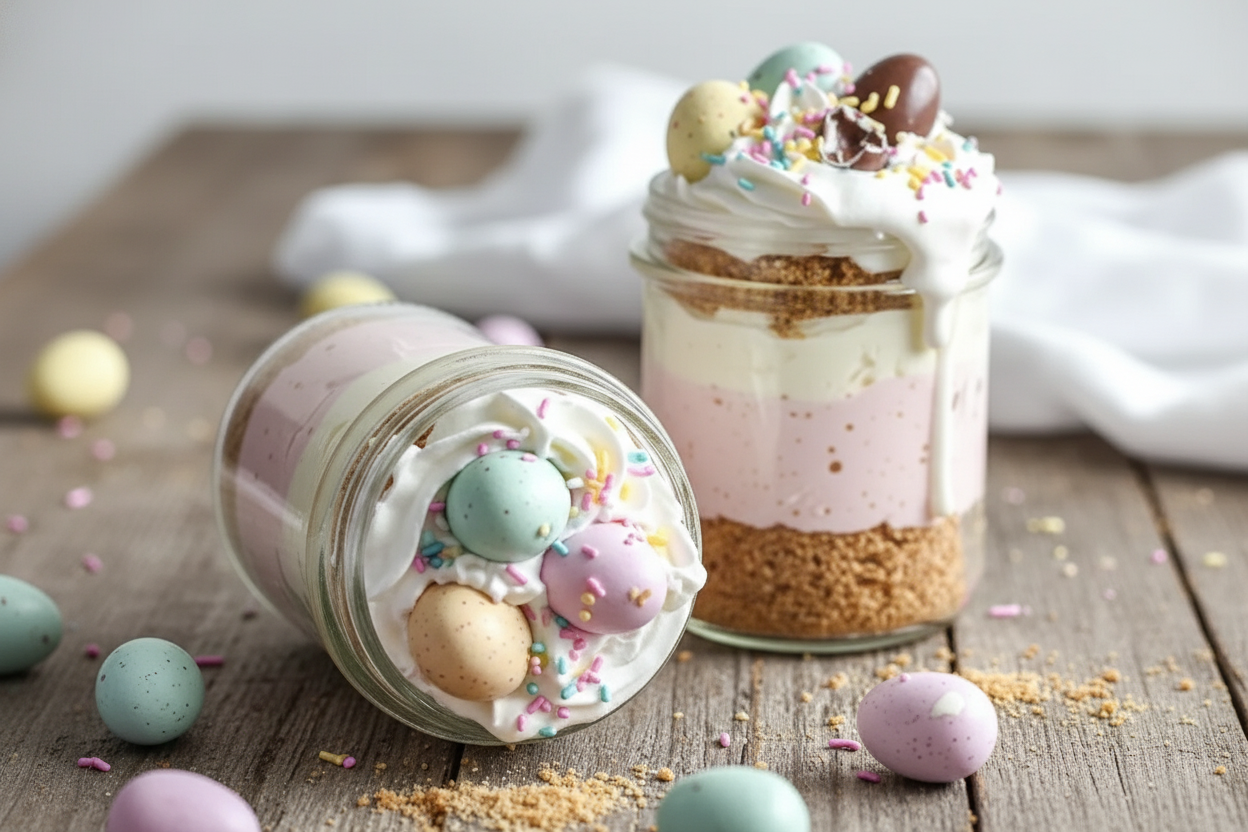 Easy, no-bake mini cheesecakes layered in jars with a graham cracker crust, a creamy filling, and festive Easter toppings.