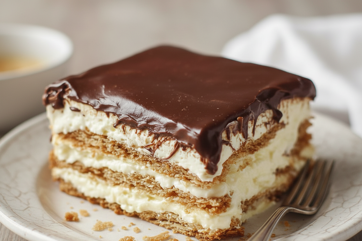 You layer graham crackers with creamy pudding. Start with a cracker layer in a pan. Then add vanilla and cheesecake pudding mix. Top with more crackers. Repeat. Finish with chocolate frosting. Chill it for hours. The magic happens in the fridge. The crackers turn cake-like. It becomes a cool, no-bake treat everyone loves.