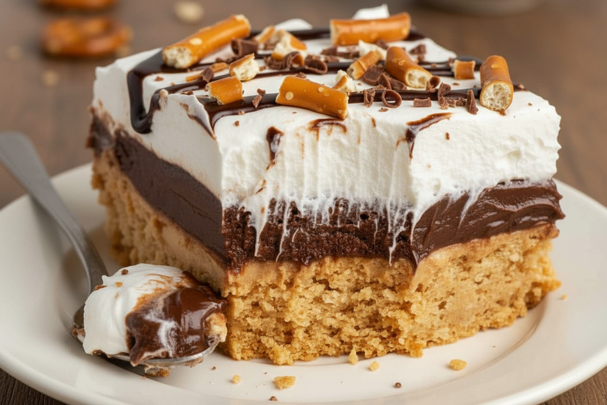 A decadent, no-bake dessert featuring a salty pretzel crust, creamy peanut butter filling, rich chocolate pudding, and fluffy whipped topping.