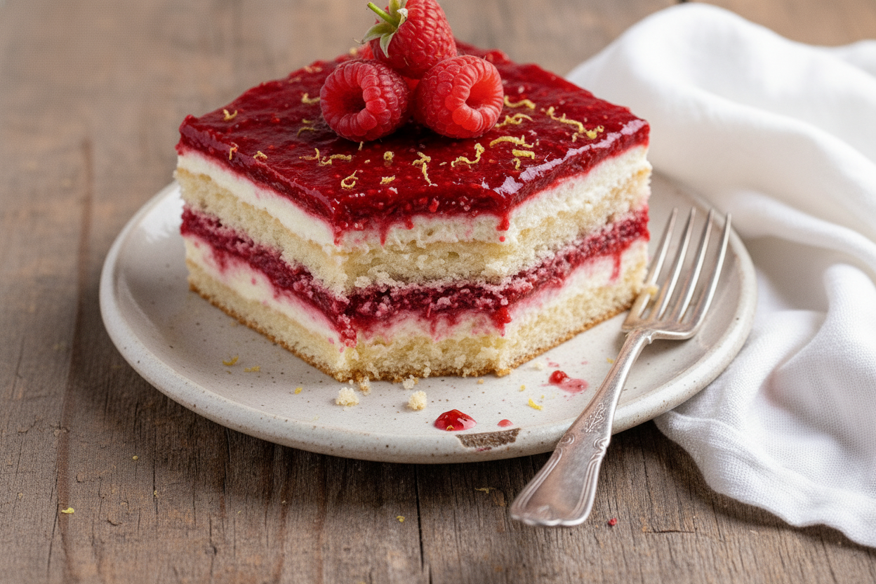 Serve each slice with a few extra fresh raspberries on the side. A small glass of sparkling water or a cup of herbal tea is lovely with it. For a fancy touch, add a mint leaf or edible flower. It’s also wonderful alongside a simple shortbread cookie. Which would you choose tonight? I think I’d go for the tea and a big slice. It reminds me of summer afternoons on the porch.