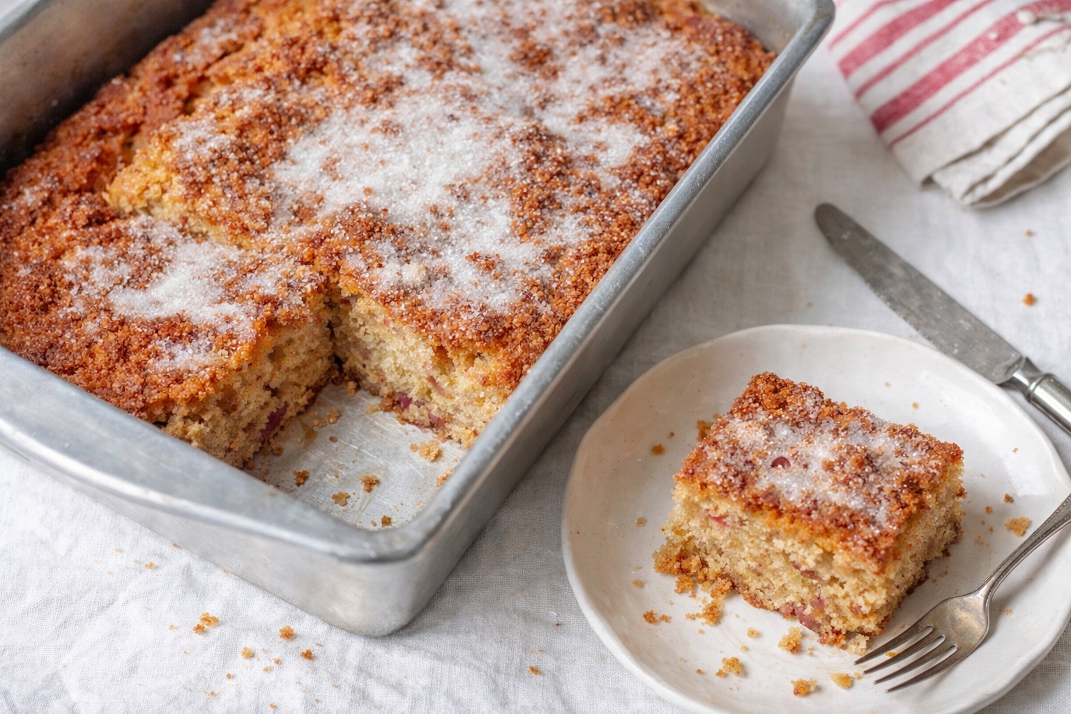 Experience the delightful contrast of textures and flavors with this Generational Rhubarb Cake Delight, featuring a tender cake base and tangy rhubarb.