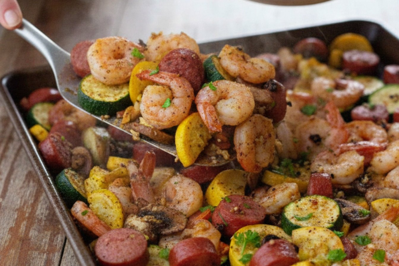 A quick and flavorful one-pan meal featuring seasoned shrimp, andouille sausage, and fresh zucchini and squash.
