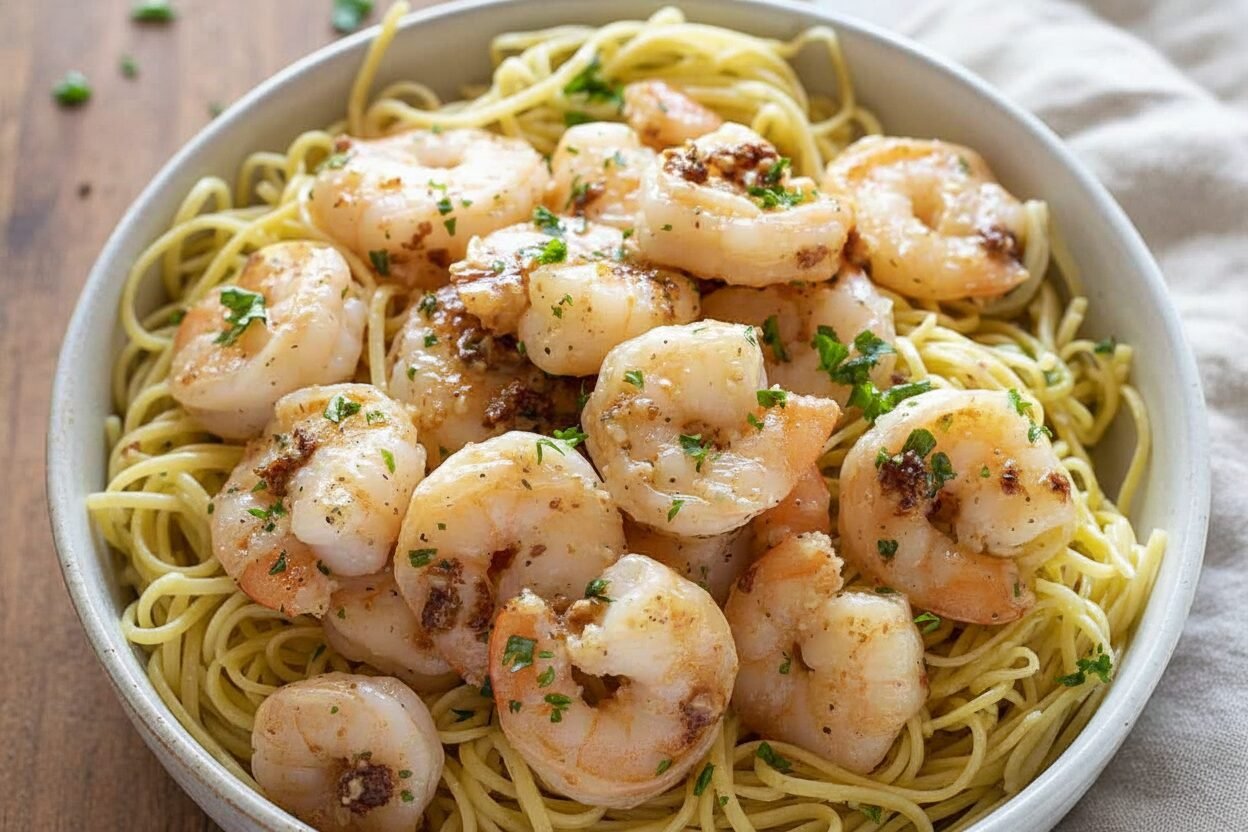 A classic and elegant pasta dish featuring tender shrimp in a garlicky, buttery white wine sauce, served over fresh homemade linguine.