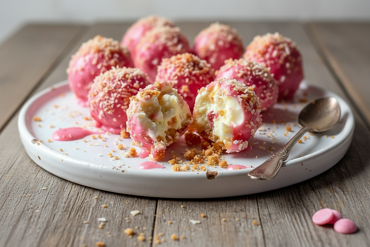 Hello, my dear. Come sit. Let’s talk about a happy little treat. These are my Strawberry Crunch Cheesecake Bites. They are no-bake and so easy. You just mix, roll, and coat. I love how they look like tiny, festive snowballs.