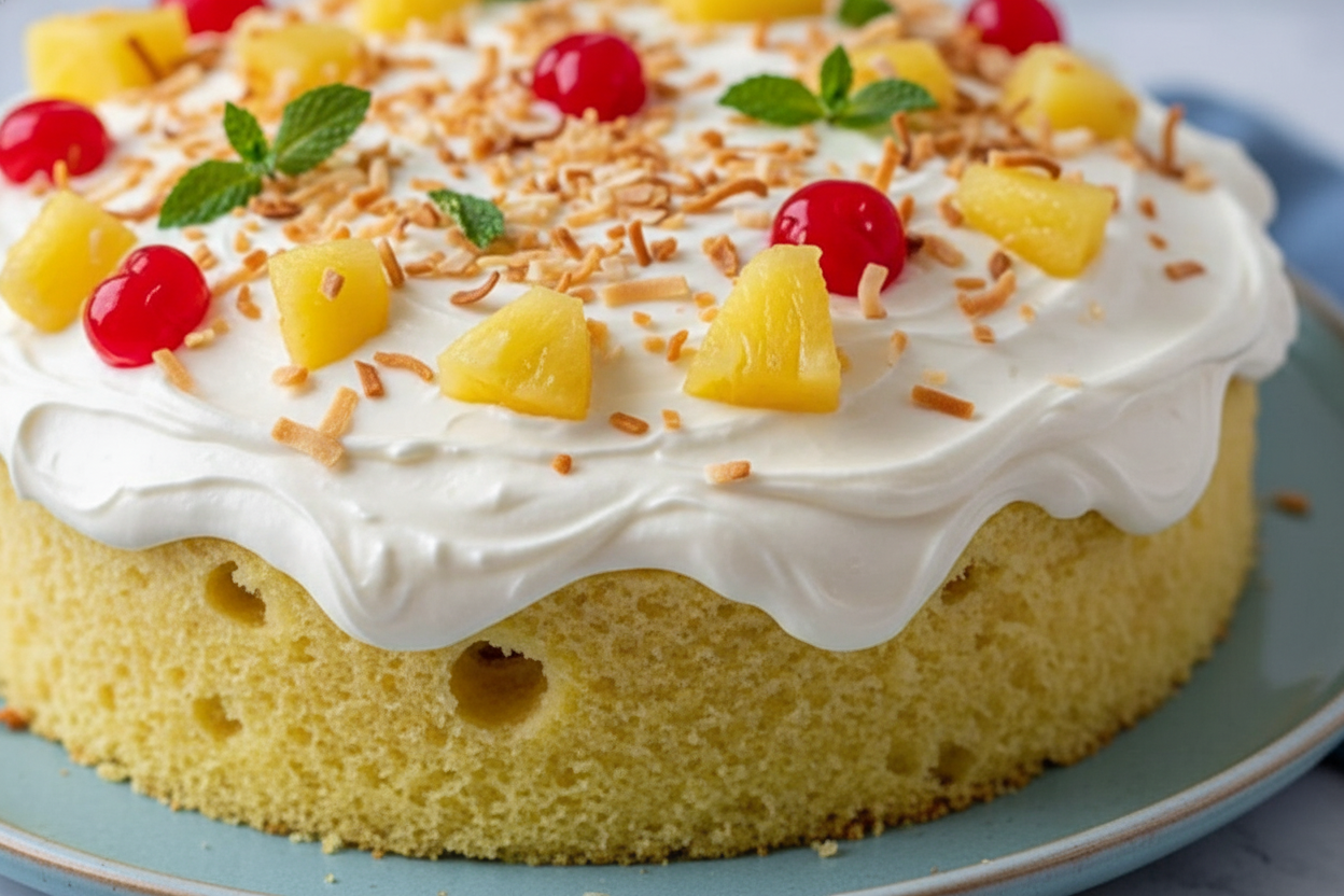A moist and easy tropical dessert cake infused with pineapple and coconut, topped with whipped cream, pineapple chunks, and cherries.
