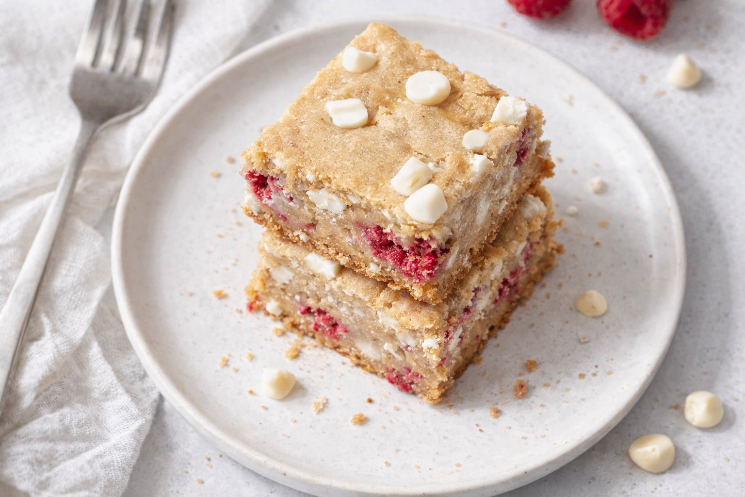 Enjoy the perfect blend of sweet white chocolate and tart raspberries in this delicious blondie delight.
