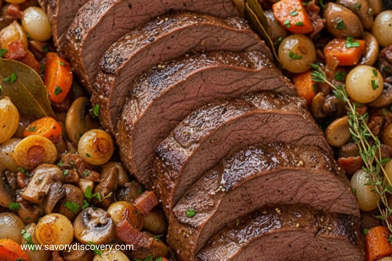 A rich and hearty Burgundy Pot Roast, slow-braised in red wine with aromatic vegetables for a perfect festive meal.