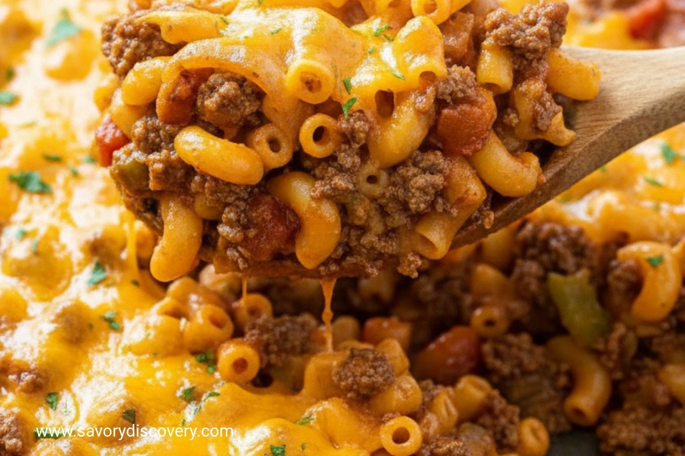 A hearty and comforting one-pot meal featuring seasoned ground beef, vegetables, and macaroni in a rich tomato sauce.