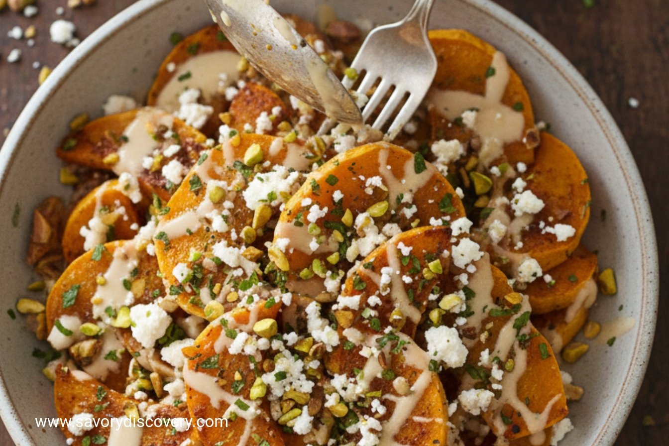 This recipe is a little party on a plate. We roast the squash until it’s caramelized and tender. Then we add salty feta and crunchy pistachios. A drizzle of lemony tahini ties it all together. Doesn’t that sound wonderful?