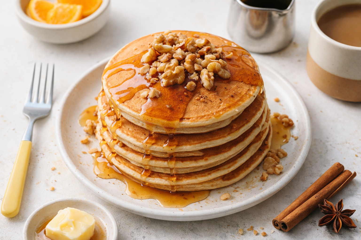 Fluffy, aromatic pancakes infused with maple syrup, cinnamon, and nutmeg for a cozy breakfast treat.