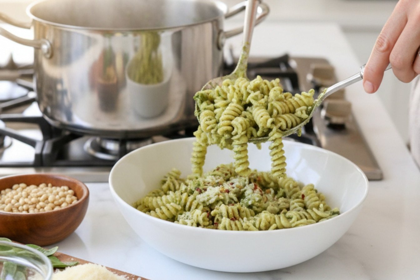 Step 3: Let’s assemble your Homemade Basil Pesto Pasta! Put the hot, drained pasta in a big bowl. Pour your beautiful green pesto all over it. Add a splash of that saved pasta water. Now, toss it all together until every noodle is coated and glossy. Do you think the pasta water makes it creamier? Share below!