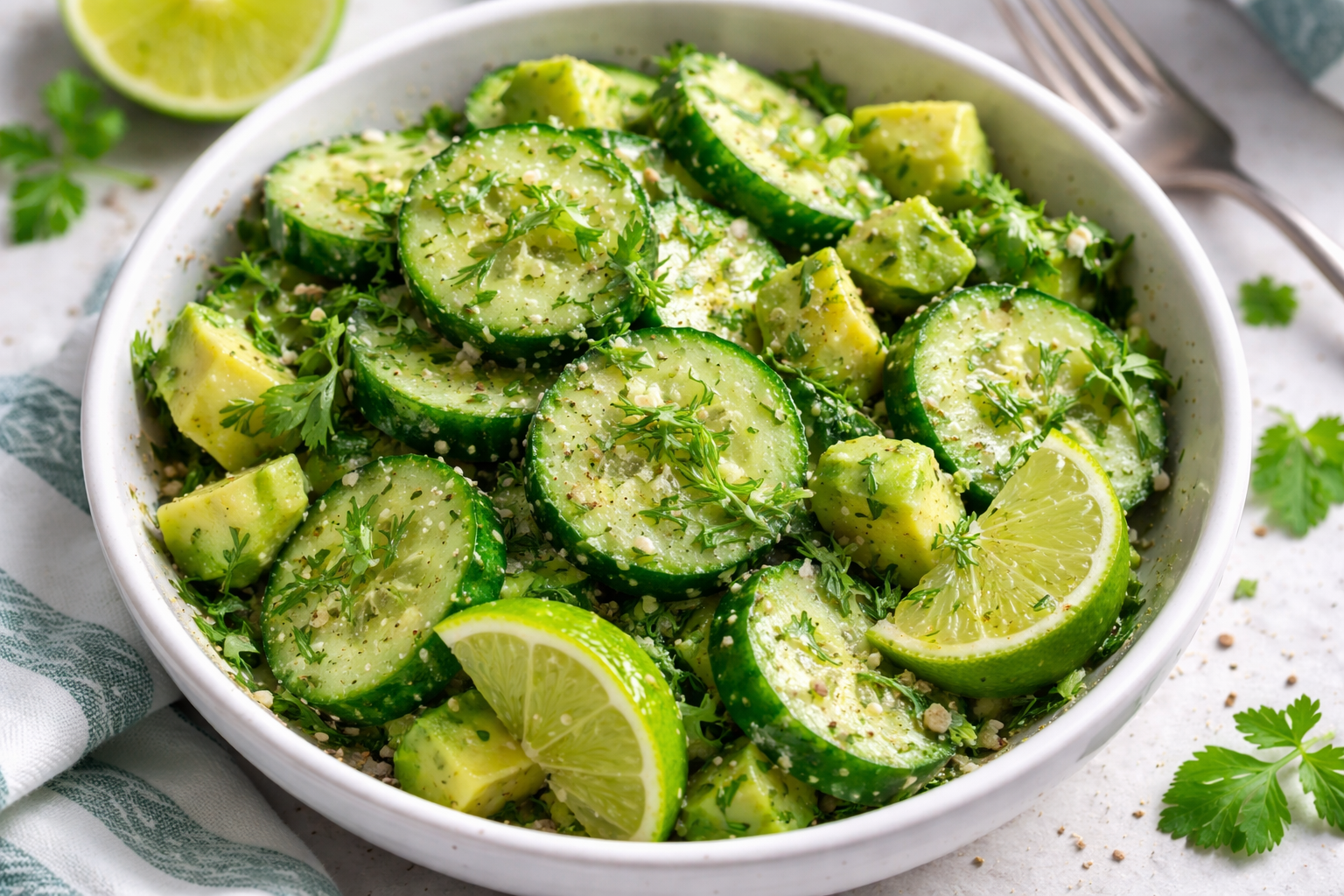 Experience the refreshing crunch of cucumbers paired with creamy avocado and zesty lime dressing in this simple yet flavorful salad.