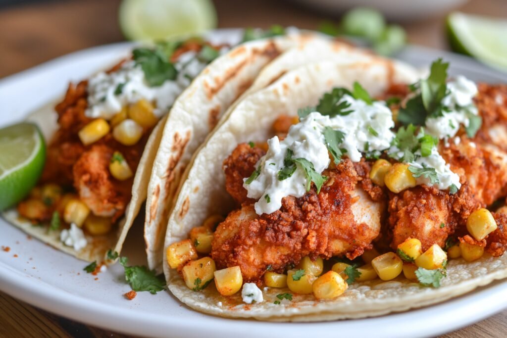 Warm tortillas before assembling your tacos. Layer fried chicken, street corn mix, and jalapeño lime ranch, then garnish for an appealing presentation.