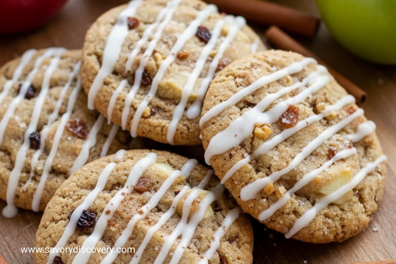 These soft, spiced apple cookies are packed with walnuts and raisins, then finished with a sweet vanilla glaze for a delightful treat.