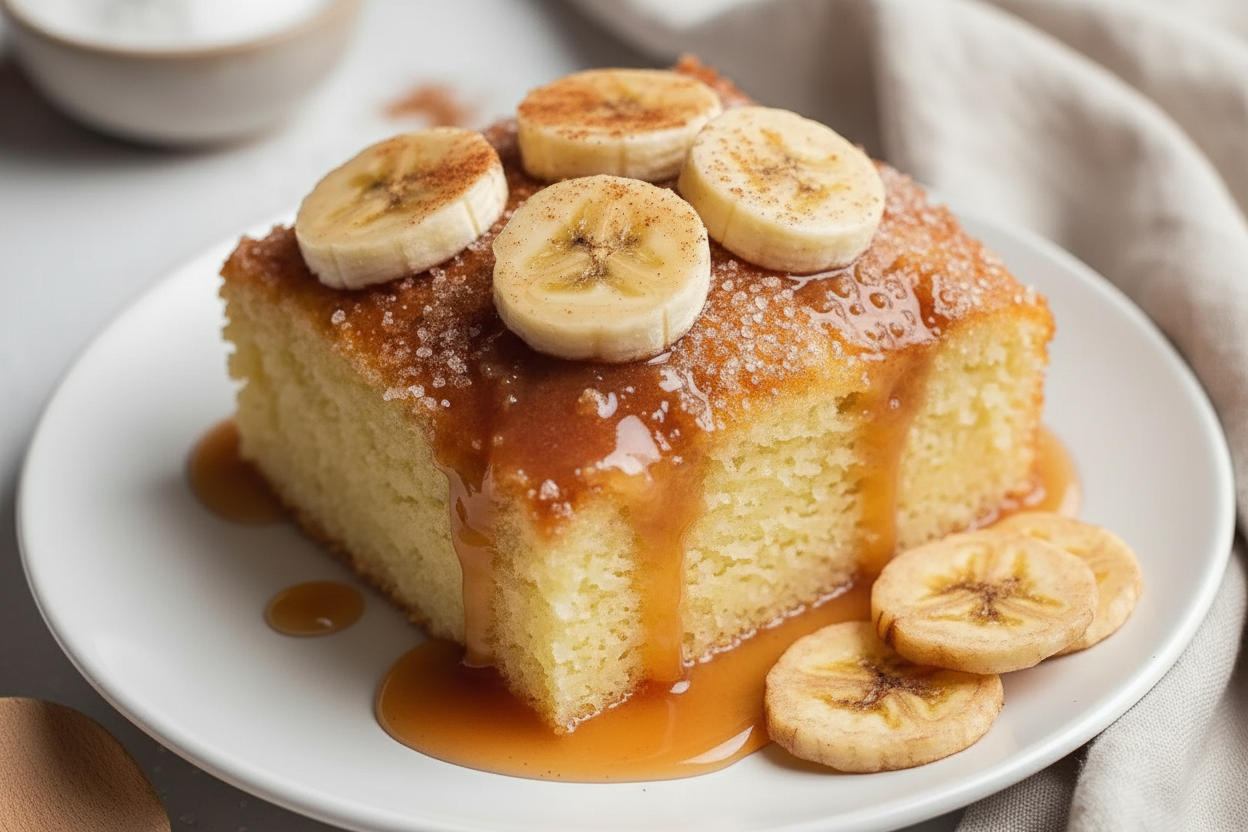 A classic, comforting dessert with a sweet banana base and a golden, cake-like topping. Simple, homestyle, and delicious.