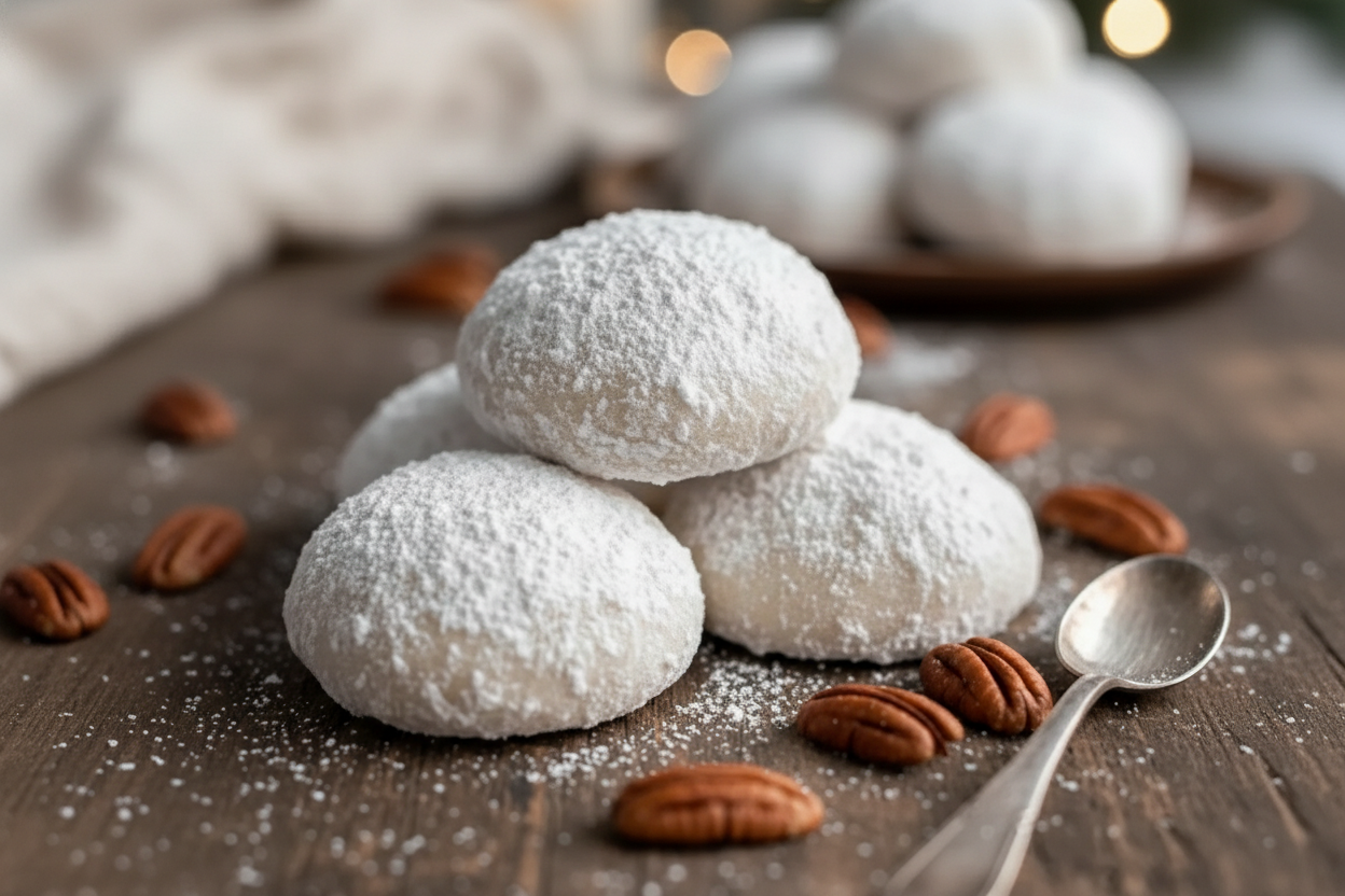 Classic, melt-in-your-mouth snowball cookies with a nutty crunch, rolled in powdered sugar for a sweet finish.