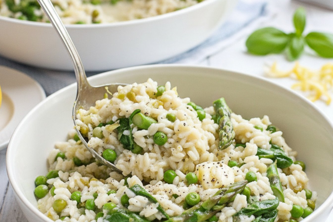 A bright and creamy risotto packed with spring vegetables like asparagus and peas, finished with lemon, mascarpone, and Parmesan.