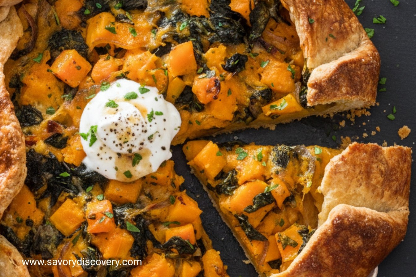 A rustic, savory tart featuring a flaky whole-wheat crust, sweet roasted butternut squash, wilted spinach, and nutty Gruyère cheese.