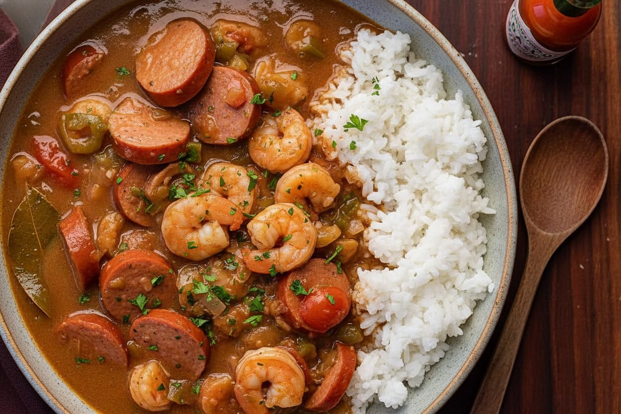 A rich and hearty Southern stew featuring a dark roux, the holy trinity of vegetables, andouille sausage, and shrimp, served over white rice.