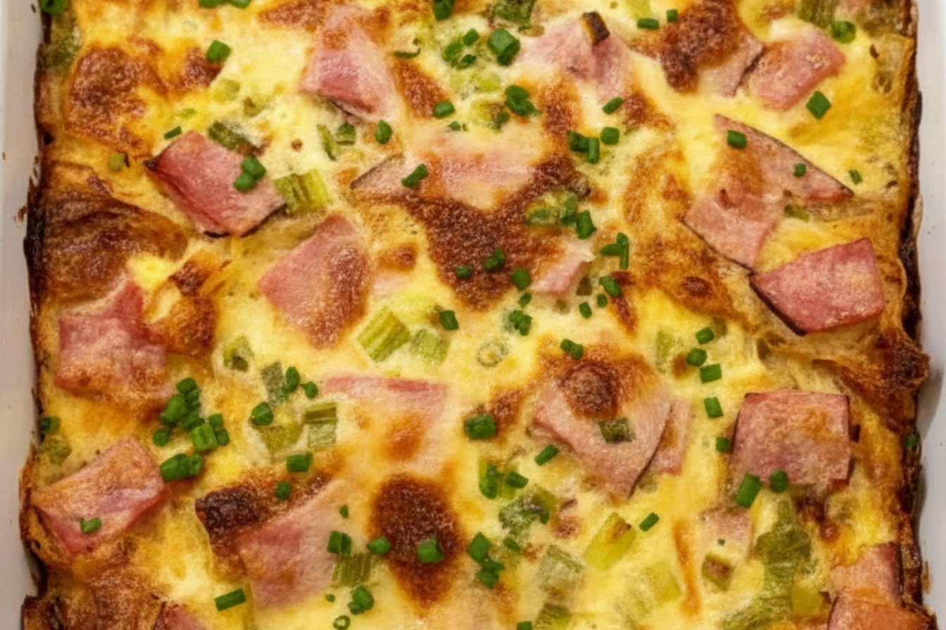 A rich and savory breakfast bake featuring buttery croissants, ham, and a creamy egg and cheese custard, perfect for a leisurely weekend brunch.