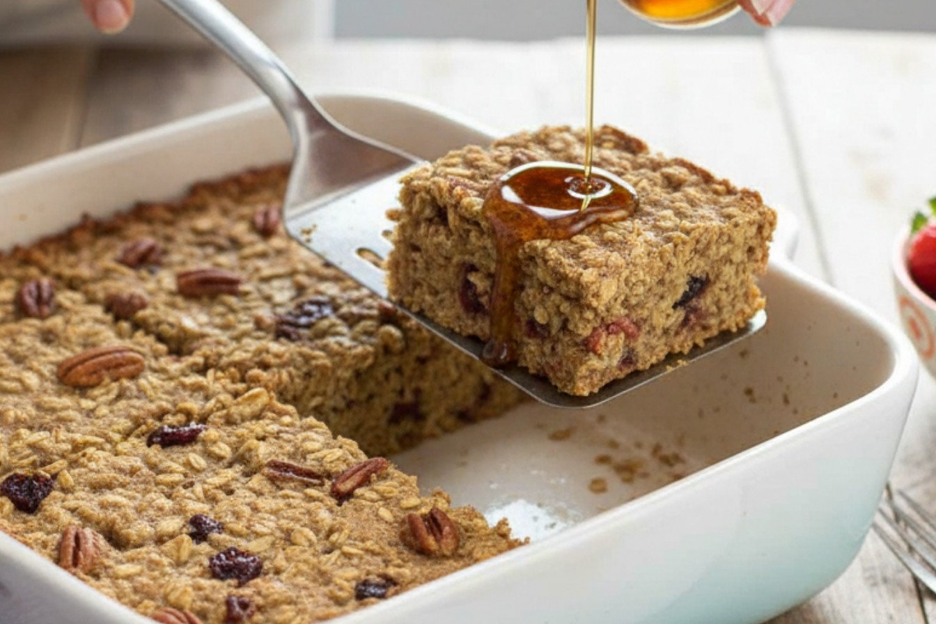 My baked oatmeal bars recipe is simple. Mix your dry oats with baking powder and cinnamon. In another bowl, mash ripe bananas until creamy. Combine everything with milk, eggs, and maple syrup. Stir in your nuts and dried fruit. Bake until golden and set. You get delicious banana maple oatmeal bars perfect for breakfast or a snack.