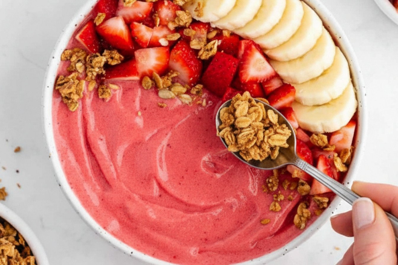This easy smoothie bowl recipe is simple. Blend frozen bananas, strawberries, vanilla, and milk. Use a blender with a tamper for a thick mix. Pour your creamy blend into a bowl. Then, have fun adding your favorite smoothie bowl toppings. It’s a quick breakfast recipe anyone can master.