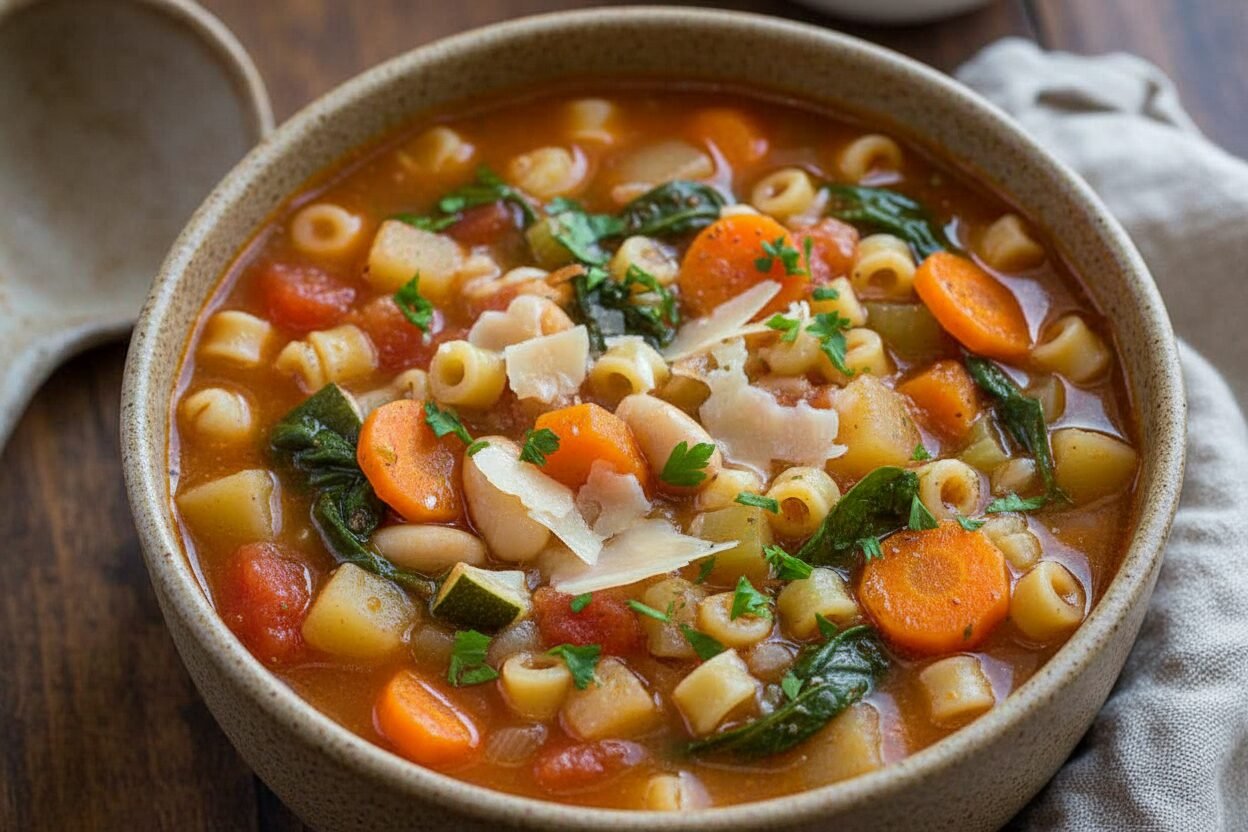 A warm and comforting Hearty Minestrone Soup, perfect for cold days. Packed with vegetables, beans, and pasta in a flavorful broth.
