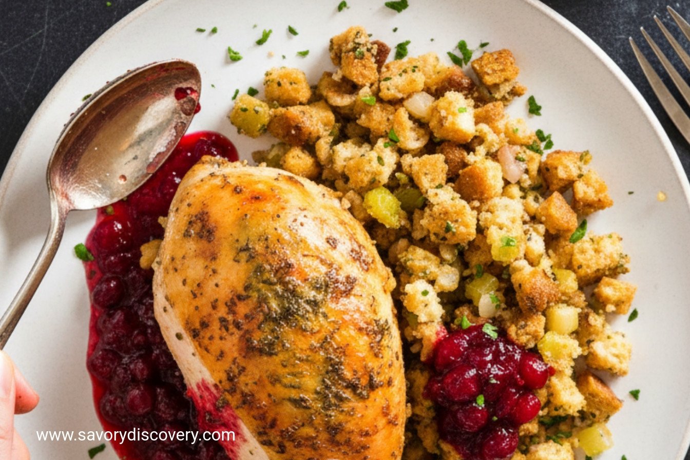 This recipe feels like a big hug. It is a whole feast in one pan. You get juicy turkey, herby stuffing, and a sweet-tart sauce. I love how the smells fill the whole house. Doesn’t that smell amazing?