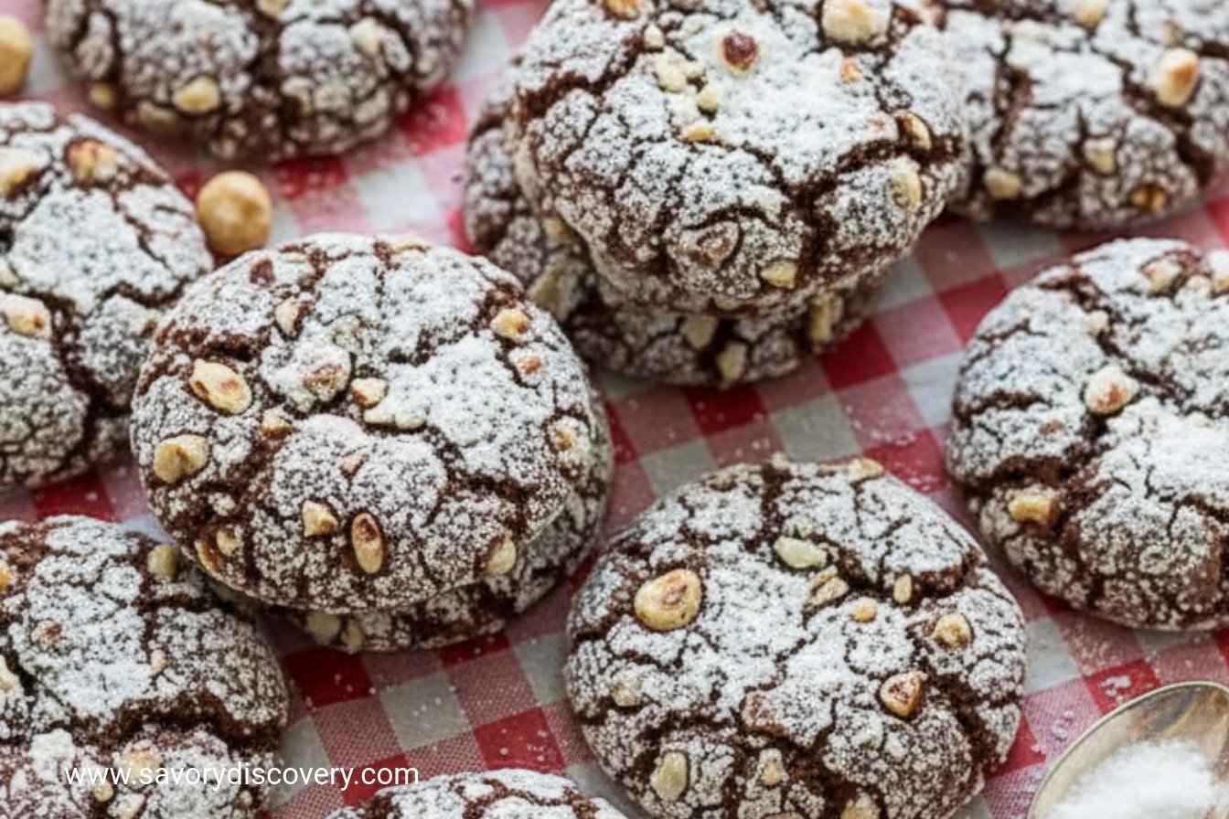 Chewy, nutty cookies packed with Nutella and toasted hazelnuts, rolled in confectioners’ sugar for a festive treat.