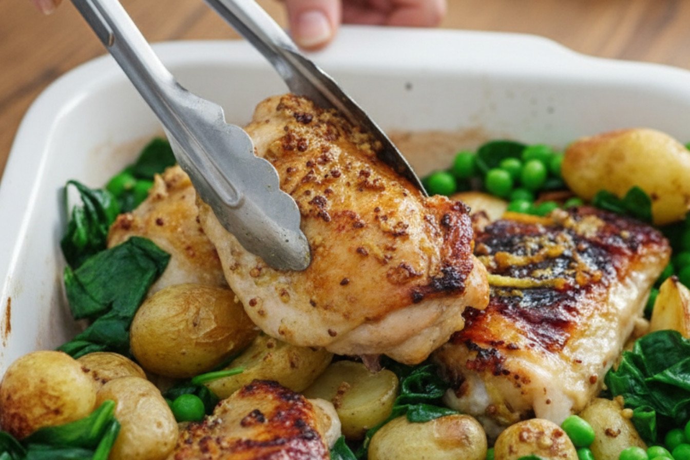Spring vegetable recipes are perfect. Try new potatoes, spinach, and peas. They roast beautifully with the chicken. The potatoes soak up the mustardy sauce. The spinach and peas add fresh color and nutrients. This combo makes an iron and fibre rich recipe. You can also use asparagus or green beans. Any veg that roasts quickly will work well here.