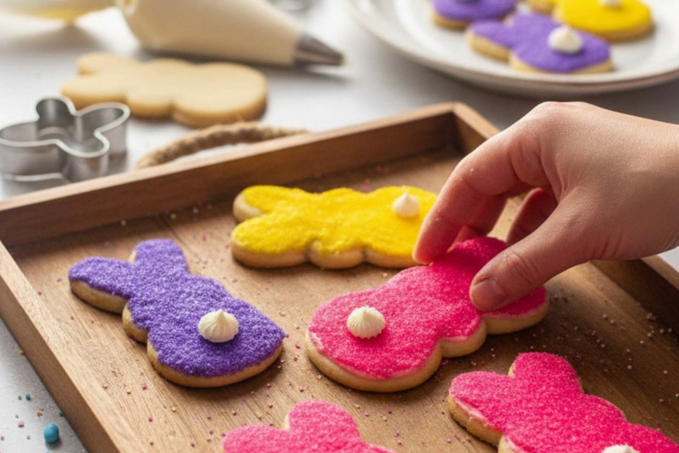 They are the cutest Easter sugar cookies. You start with a simple sugar cookie recipe. Then you cut them into bunny shapes. The fun part is the decorating. You coat them in bright colored sugar. You can even make funny bunny butt cookies with a piped tail.