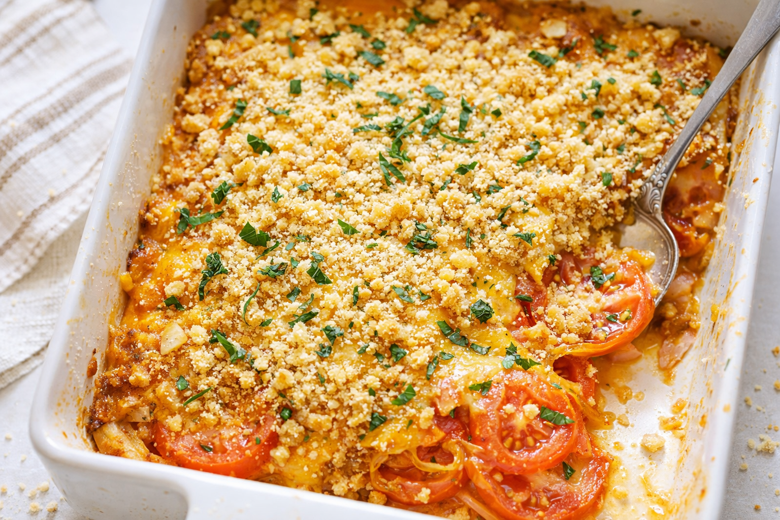 Keep leftovers in the fridge for up to 3 days. Cover the dish tightly with foil or plastic wrap. To reheat, pop it in the oven at 325°F for 15 minutes. The microwave works too, but the topping won’t stay crispy. *Fun fact: Salting tomatoes first helps them hold shape when reheated.* Want to freeze it? Skip the crackers, add them fresh after thawing and baking. Batch-cook note: Double the recipe in a 9×13-inch dish—just add 10 minutes to bake time.