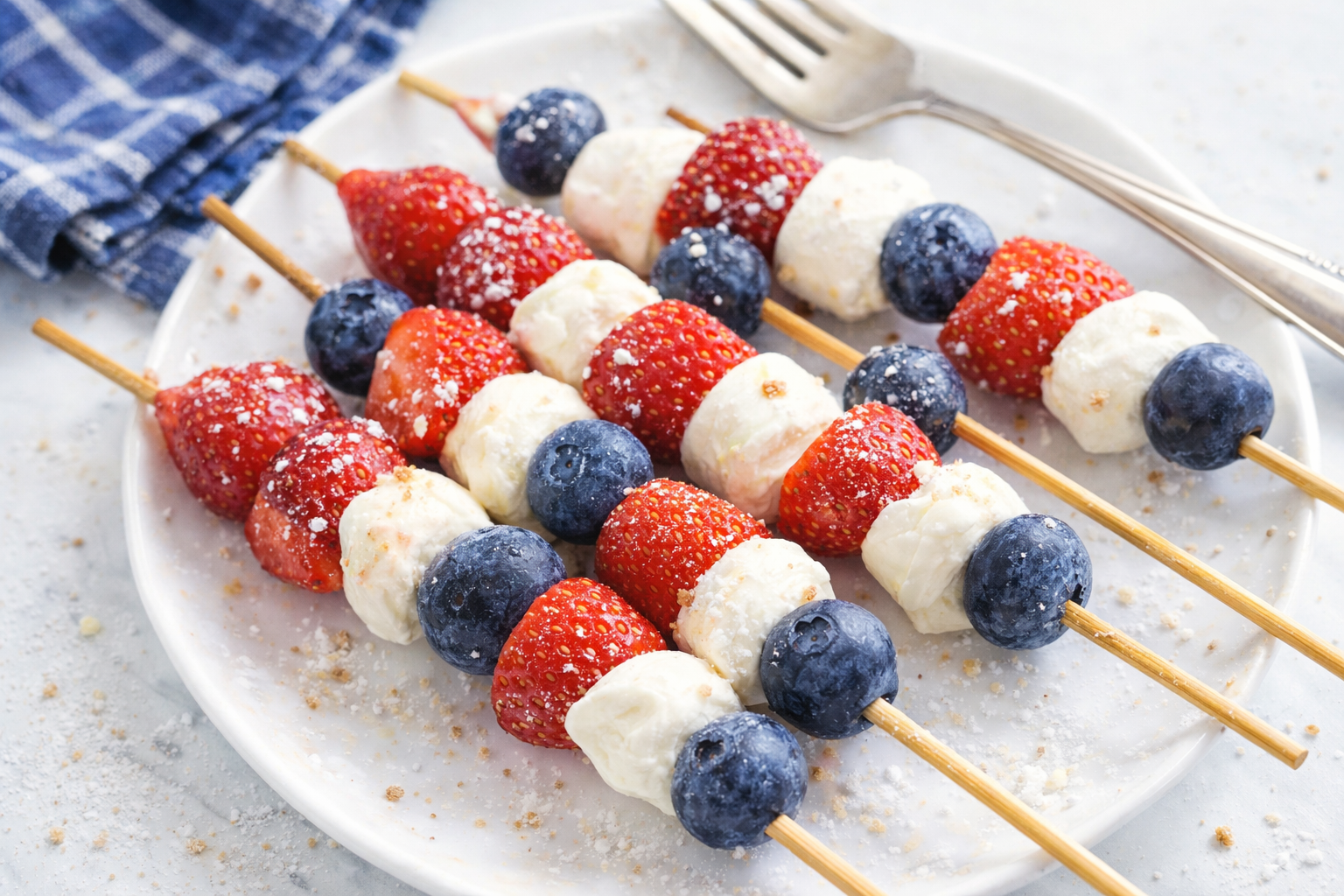 Fruit skewers date back to ancient Persia, where they were served at feasts. This red, white, and blue version became popular in the U.S. during patriotic holidays. *Did you know some cultures believe threaded fruit brings good luck?*
