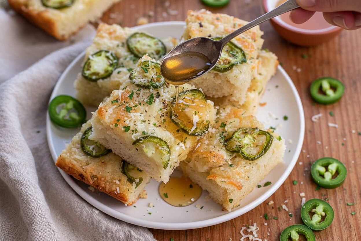 A savory and slightly sweet quick bread featuring a soft, herbed dough topped with melted mozzarella, spicy jalapeños, and a drizzle of honey.