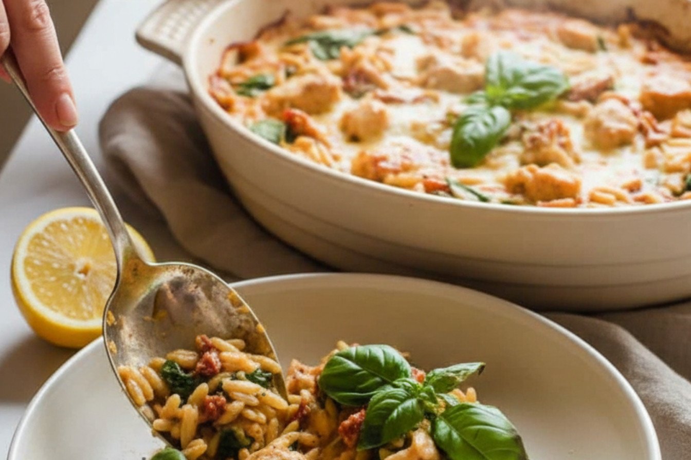 One Pot Creamy Lemon Chicken Orzo with sun-dried tomatoes and spinach in a rich, herby sauce.