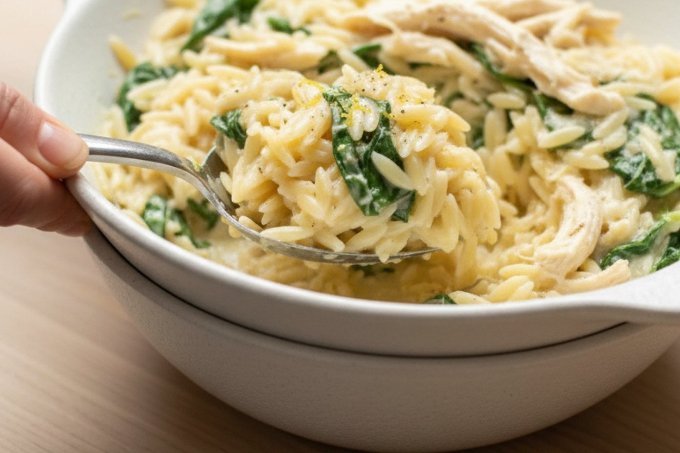 A creamy, comforting one-pot meal featuring tender chicken, orzo pasta, and fresh spinach in a bright lemon parmesan sauce.
