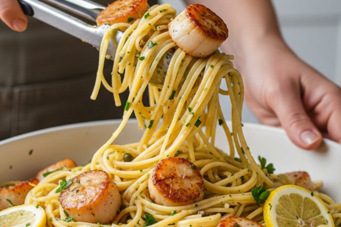 A luxurious and flavorful pasta dish featuring perfectly seared scallops in a bright lemon garlic white wine sauce.