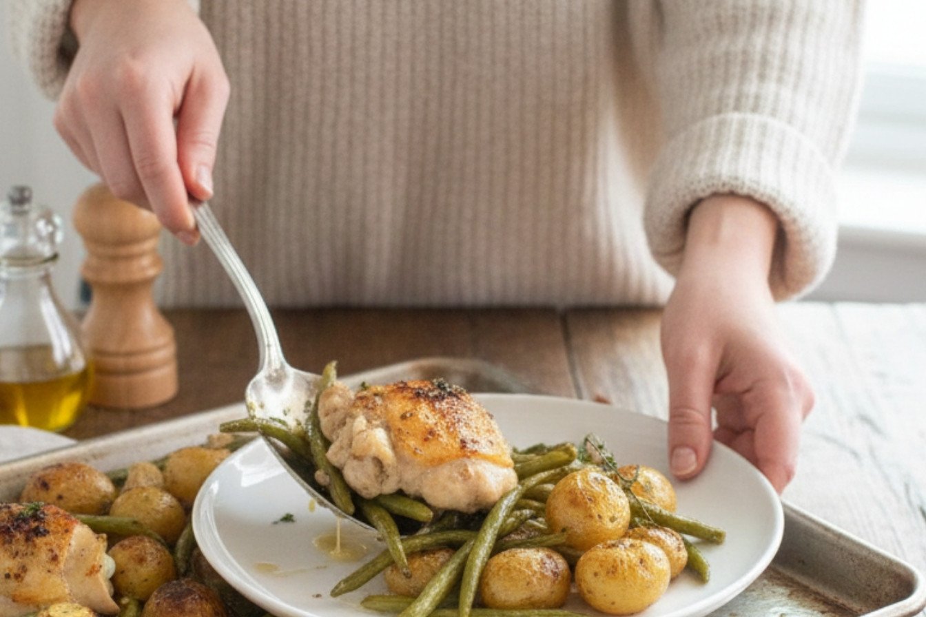 A simple and flavorful one-pan meal featuring juicy, herb-marinated chicken thighs roasted with tender potatoes and crisp green beans.