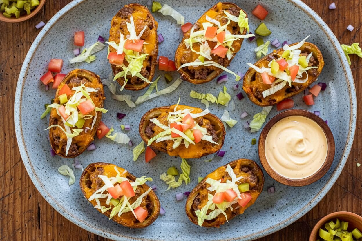 These Loaded Cheeseburger Potato Skins combine crispy potato shells with a savory ground beef filling, melted cheese, and classic burger toppings for the ultimate appetizer.
