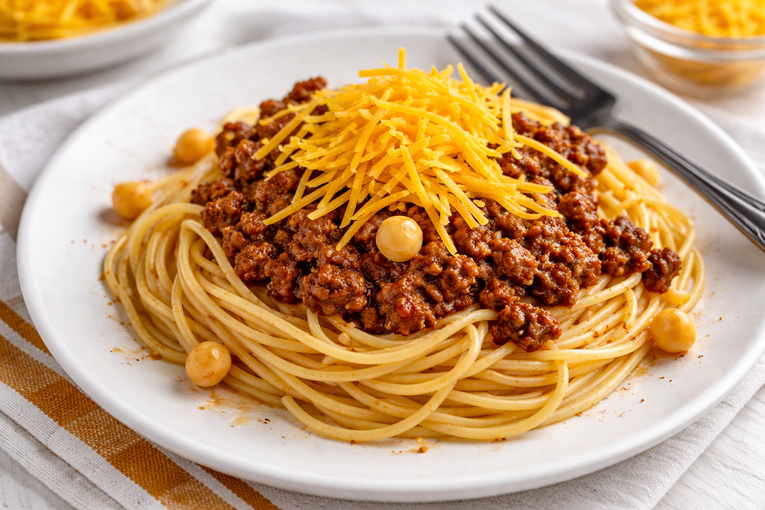 A classic Ohio recipe featuring a rich, spiced chili served over spaghetti or hot dogs.