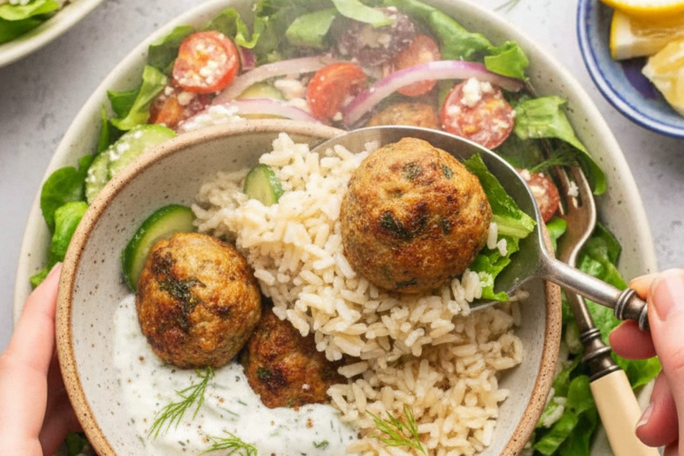 This is more than just food. It’s a happy, complete meal. You get your crunchy lettuce, warm rice, and those juicy meatballs. Then you add the cool tzatziki sauce on top. Every bite has something different. It keeps your taste buds smiling.