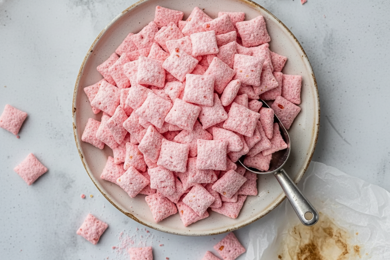 A sweet, crunchy, and fruity snack mix featuring white chocolate-coated cereal tossed in a homemade strawberry sugar powder.