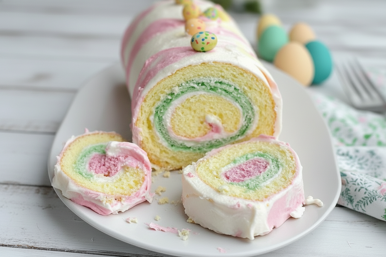 A delightful and festive Easter dessert, featuring a light sponge cake rolled with sweet vanilla cream and decorated with colorful pastel chocolate and Easter candies.
